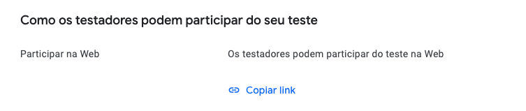- Na parte inferior da página, clique em "Copiar link" e envie ele para o usuário que você adicionou como testador. O download do app será feito diretamente no Google Play, então o e-mail adicionado como testador deve ser o mesmo e-mail logado na loja