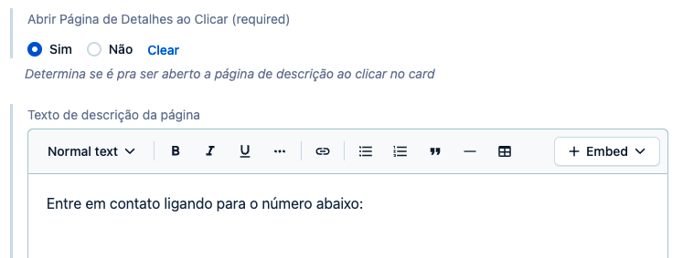 - É possível abrir uma página através dos cards do módulo de conta, ao invés de um link externo. Para isso, é necessário validar com o nosso time de Suporte se a funcionalidade está ativa na sua conta e realizar o seguinte ajuste: selecionar a opção "Sim" em 'Abrir Página de Detalhes ao Clicar', e após isso preencher com o texto que deseja na caixa de texto abaixo de 'Texto de descrição da página':