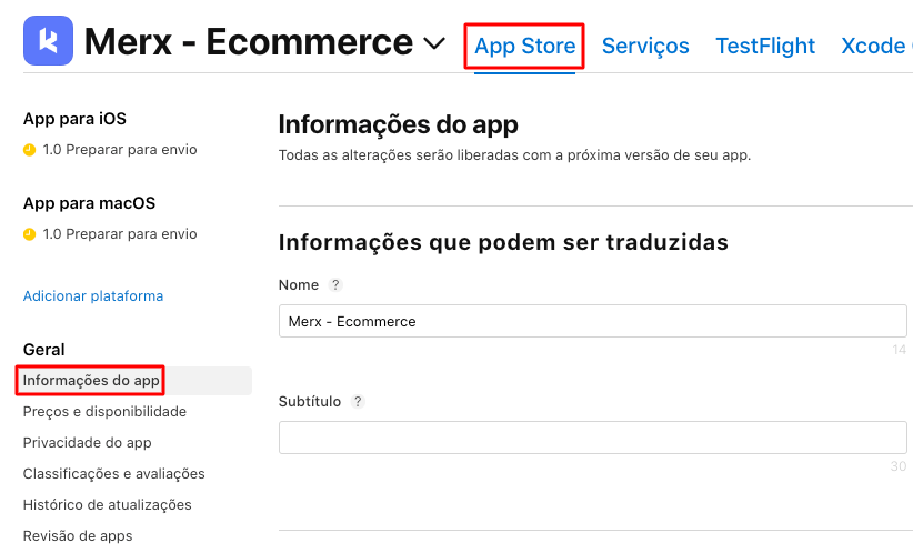 Após login realizado, na aba App Store, em Geral >> Informações do app