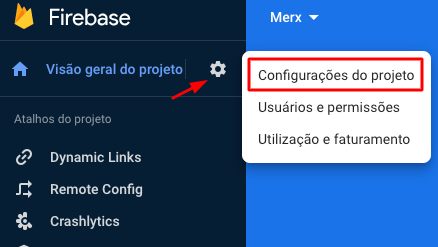 - No menu lateral esquerdo, em "Visão geral do projeto", clique no ícone de engrenagem das configurações (⚙️) e selecione "Configurações do projeto":