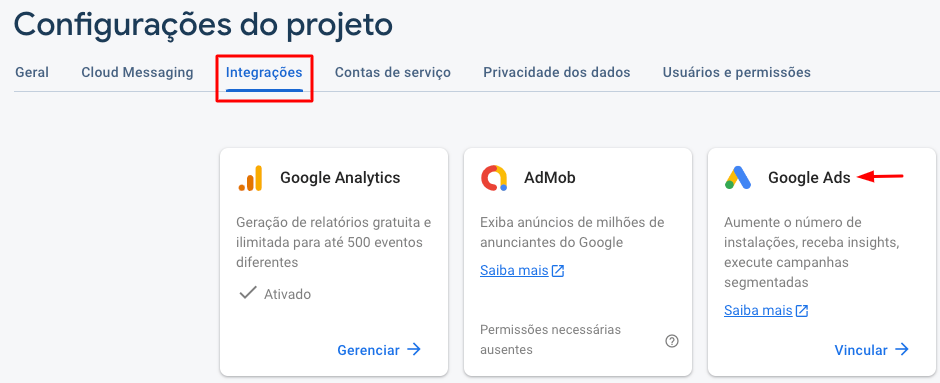 Após acessar a tela de “Configurações do projeto”, clique na opção “Integrações” e após em "Google Ads":