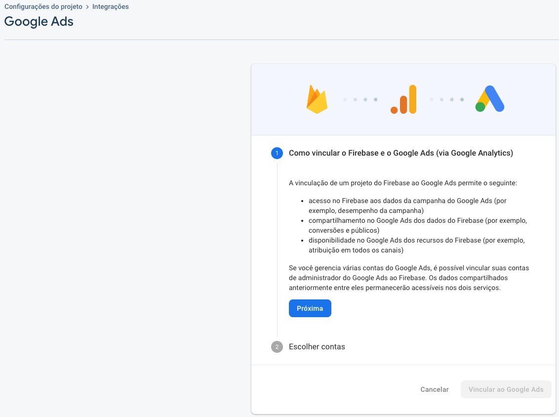 Para finalizar a integração, basta seguir com as informações e os aceites, para a escolha de contas, no próprio Firebase.