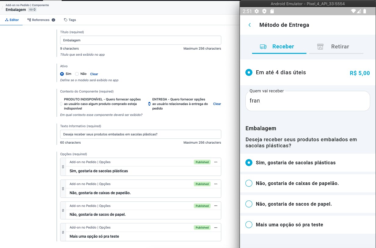 - Na aba "Content", clique em "Add Entry" e selecione a opção do componente "Add-on no Pedido"
