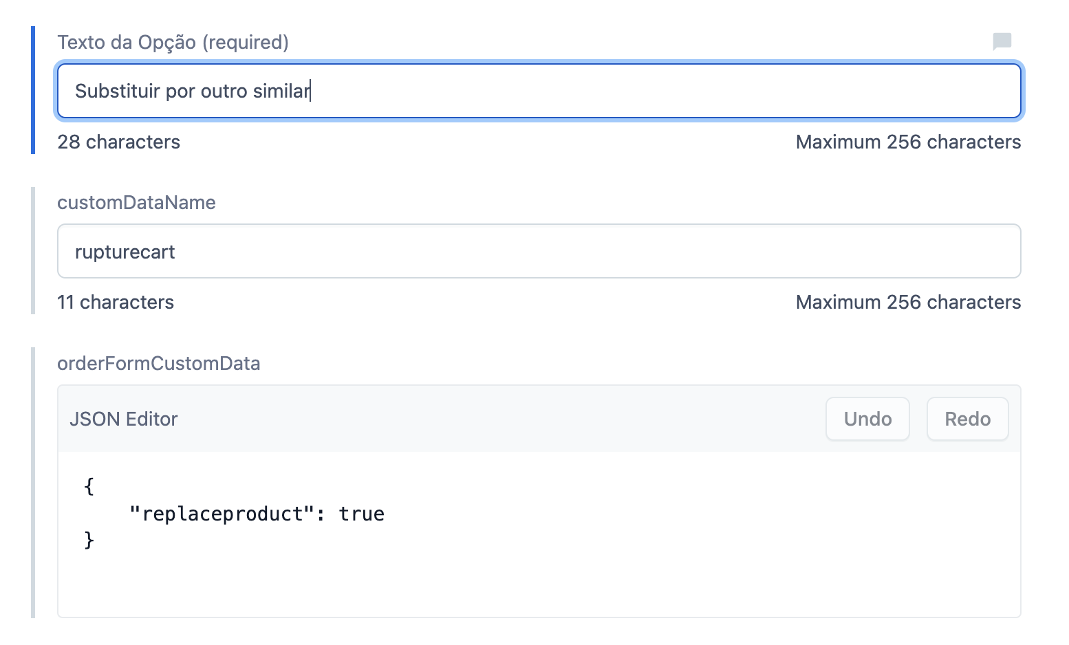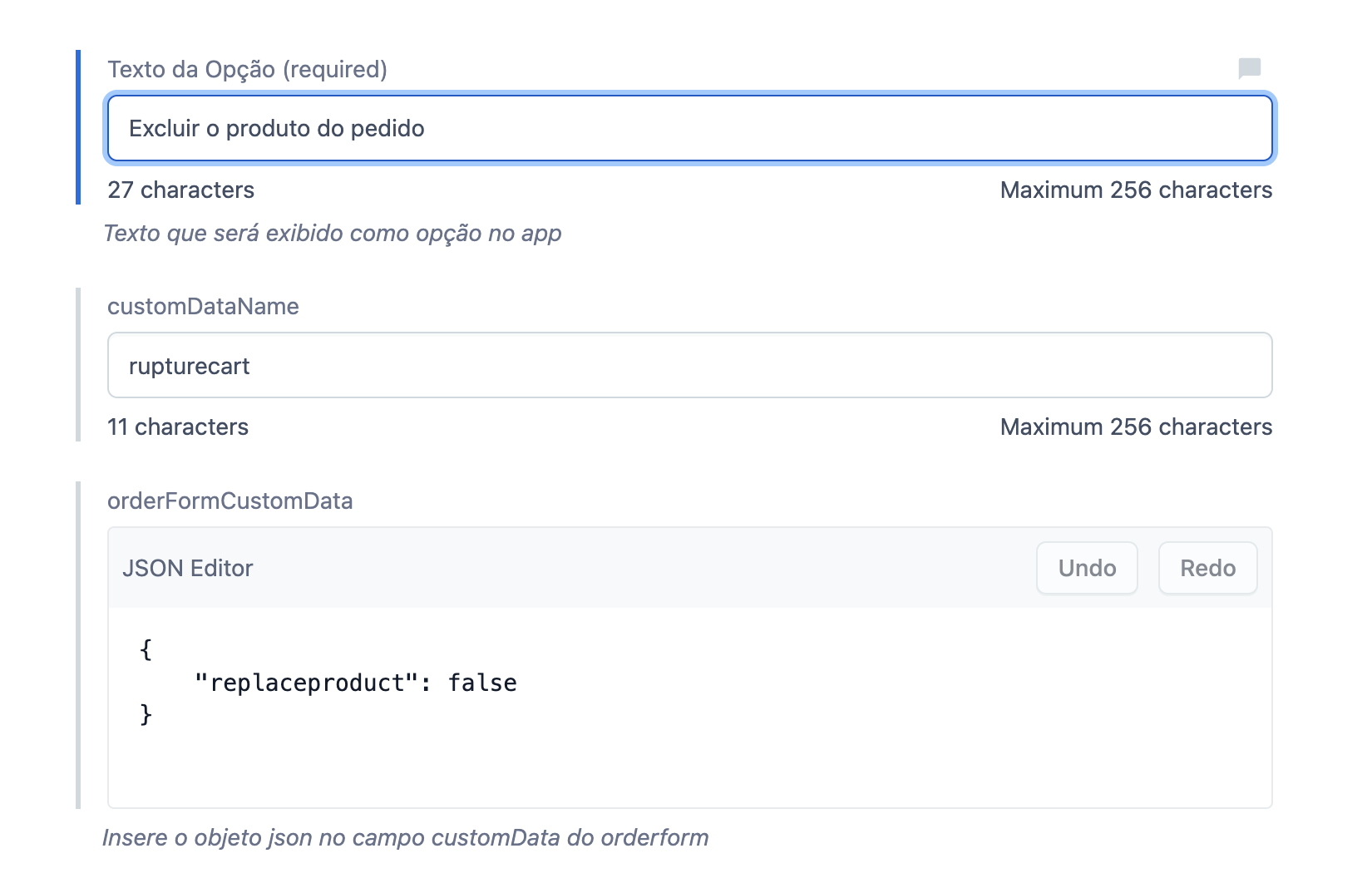 Obs.: quando a opção selecionada na parte de contexto for “CARRINHO” e quiser substituir um item, é necessário colocar como “true” igual na imagem 1. Se quiser apenas excluir um item, colocar como “false”, conforme imagem 2.