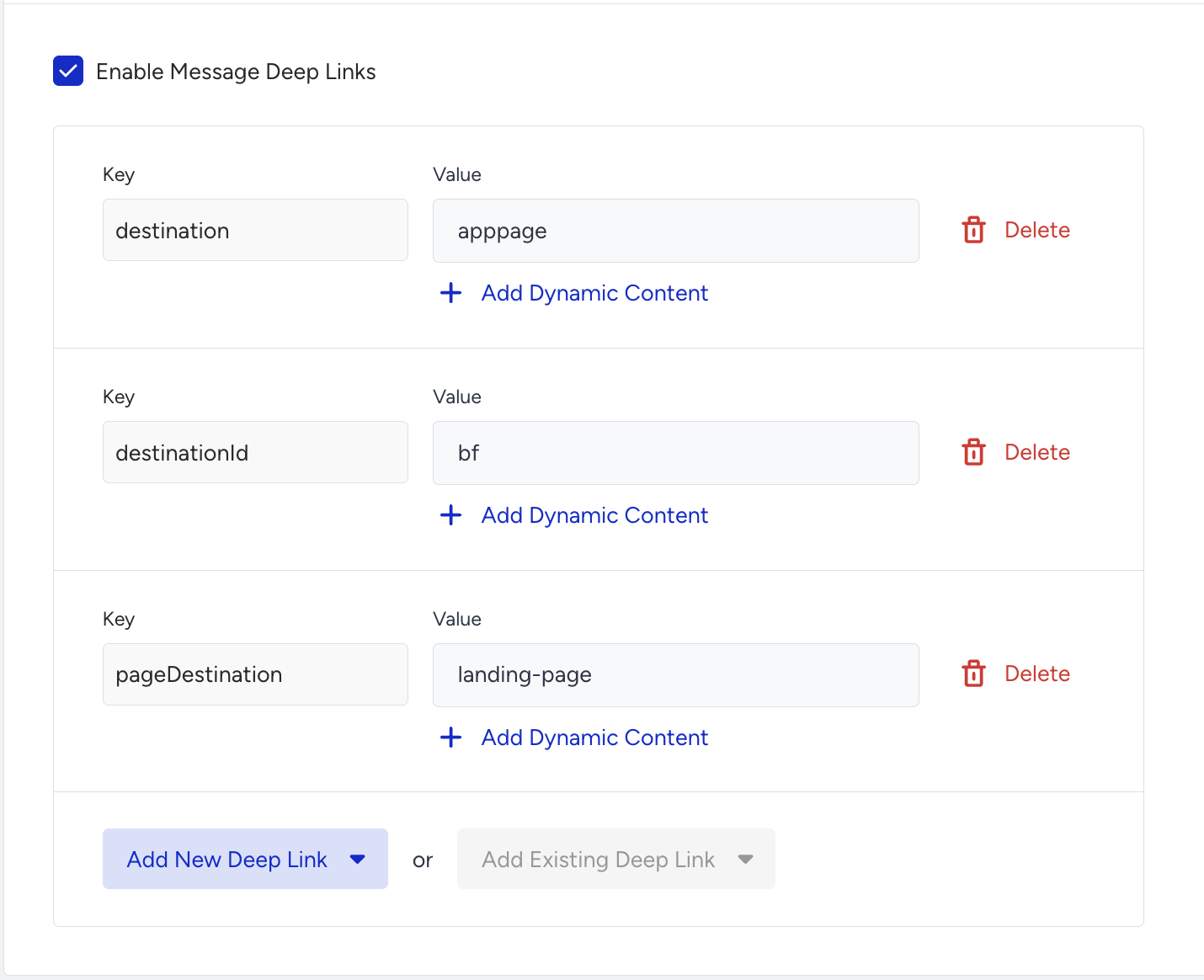 - Quando o destino for uma Landing Page, este campo deve ser preenchido com o ID da Landing Page configurado no CMS. é necessário também adicionar um campo nessa etapa com a chave
