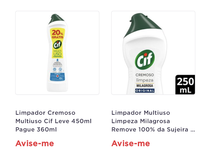 - Personalização de Produto Indisponível: Permite a exibição de um botão escrito "Avise-me" e o card não fica mais com os tons de cinza de produto indisponível.