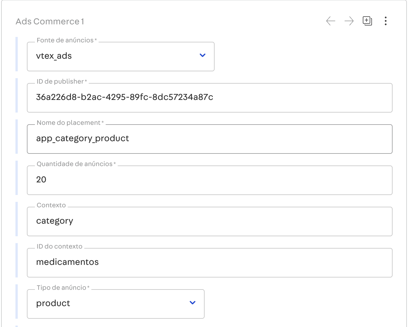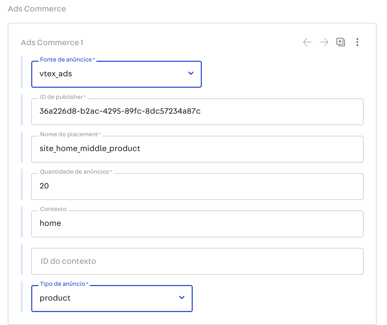 Nome do placement: Determina em qual página o anúncio aparece- semelhante ao cadastrado painel do VTEX Ads. Exemplo: