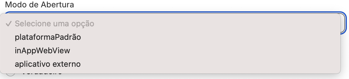 Caso desative a opção "Abrir como tela", você deve selecionar uma das as opções abaixo para que o aplicativo faça o redirecionamento do link da forma correta: